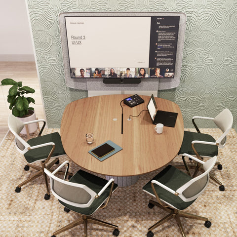 Ocular™ tables designed for hybrid collaboration. Unique table shapes improve sightlines, creating a more equitable experience for in person and remote meeting participants.