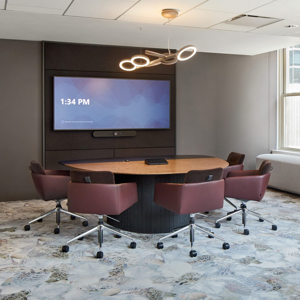Ocular™ tables designed for hybrid collaboration. Unique table shapes improve sightlines, creating a more equitable experience for in person and remote meeting participants.
