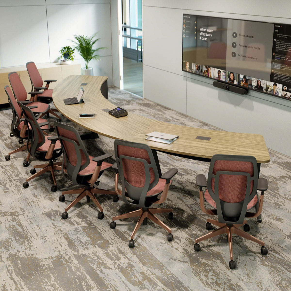 Ocular™ tables designed for hybrid collaboration. Unique table shapes improve sightlines, creating a more equitable experience for in person and remote meeting participants.